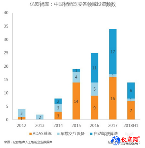 在智能駕駛領(lǐng)域,人工智能主要應(yīng)用于三大領(lǐng)域:ADAS系統(tǒng)、自動(dòng)駕駛算法和車載交互系統(tǒng)(激光雷達(dá)等傳感器設(shè)備,在本次研究中被歸入“基礎(chǔ)元件”行業(yè))。其中,ADAS系統(tǒng)領(lǐng)域共獲投50次,占智能駕駛?cè)I(lǐng)域投資的47.2%,是智能駕駛領(lǐng)域最受資本追捧的應(yīng)用領(lǐng)域。自動(dòng)駕駛算法類公司緊隨其后。