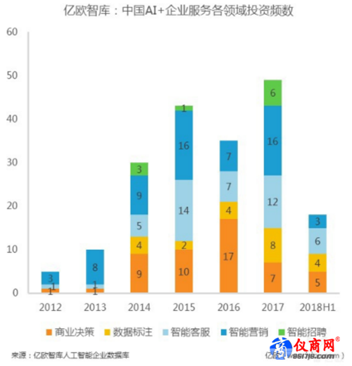 在企業(yè)服務(wù)領(lǐng)域,人工智能主要應(yīng)用于五大領(lǐng)域:智能營(yíng)銷、智能客服、數(shù)據(jù)標(biāo)注、商業(yè)決策和智能招聘。其中,智能營(yíng)銷領(lǐng)域共獲投62次,占企業(yè)服務(wù)全領(lǐng)域投資的33%,智能客服和商業(yè)決策的融資情況緊隨其后。