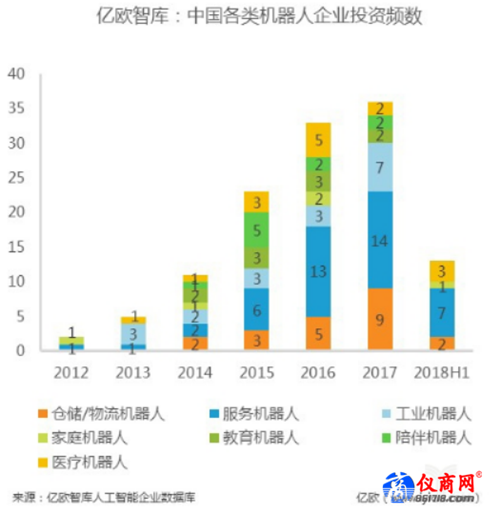 在各類機(jī)器人中,服務(wù)機(jī)器人的獲投次數(shù)最高,共獲投45次,占機(jī)器人全領(lǐng)域投資的35.8%,倉(cāng)儲(chǔ)/物流機(jī)器人、工業(yè)機(jī)器人也備受資本青睞。