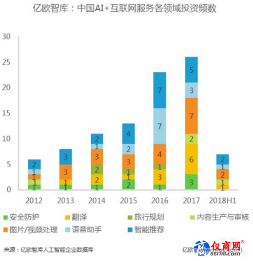 在AI+互聯(lián)網(wǎng)服務(wù)領(lǐng)域,人工智能主要應(yīng)用于七大領(lǐng)域:安全防護(hù)、翻譯、語(yǔ)音助手、智能推薦、圖片/視頻處理、旅行規(guī)劃和內(nèi)容生產(chǎn)與審核。其中,智能推薦領(lǐng)域共獲投25次,占AI+互聯(lián)網(wǎng)服務(wù)全領(lǐng)域投資的26.6%,緊隨其后的有圖片/視頻處理、翻譯、語(yǔ)音助手。各細(xì)分領(lǐng)域的投資分布相對(duì)均衡。