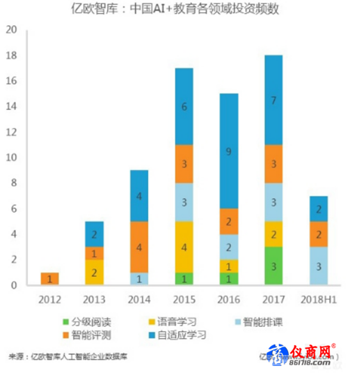 在教育領(lǐng)域,人工智能主要有五大應(yīng)用:自適應(yīng)學(xué)習(xí)、分級(jí)閱讀、智能排課、智能評(píng)測(cè)和語(yǔ)音學(xué)習(xí)。其中,自適應(yīng)學(xué)習(xí)領(lǐng)域共獲投30次,占AI+教育全領(lǐng)域投資的41.7%。其次,語(yǔ)音學(xué)習(xí)和智能評(píng)測(cè)的獲投頻數(shù)也較高。