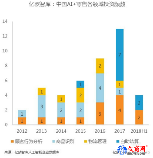 在零售領(lǐng)域,人工智能主要有四大應(yīng)用:顧客行為分析、商品識(shí)別、物流管理和自助結(jié)算。其中,商品識(shí)別領(lǐng)域共獲投13次,占AI+零售全領(lǐng)域投資的30.2%,自助結(jié)算和顧客行為分析緊隨其后。