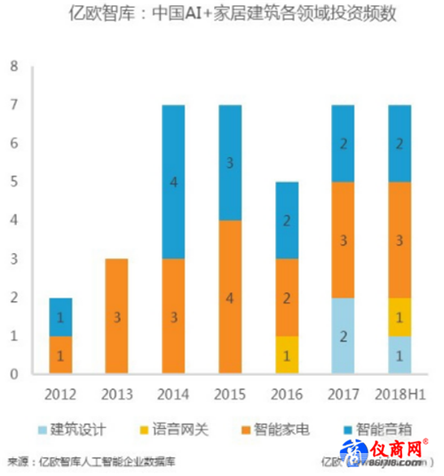 在家居建筑領(lǐng)域,人工智能主要有四大應(yīng)用:智能家電、智能音箱、語(yǔ)音網(wǎng)關(guān)和建筑設(shè)計(jì)。其中,智能家電領(lǐng)域共獲投19次,占AI+家居建筑全領(lǐng)域投資的50%,智能音箱緊隨其后。