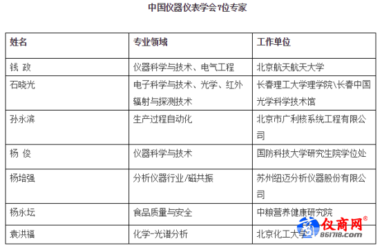 在入選的179名專家中,中國儀器儀表學會推薦的7名專家分別為北京化工大學袁洪福、長春理工大學理學院\長春中國光學科學技術(shù)館石曉光、北京市廣利核系統(tǒng)工程有限公司孫永濱、國防科技大學研究生院學位處楊俊、蘇州紐邁分析儀器股份有限公司楊培強、中糧營養(yǎng)健康研究院楊永壇、北京化工大學袁洪福。