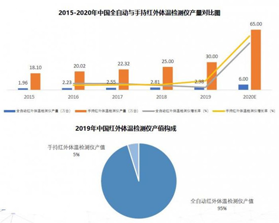 報(bào)告指出,由于手持紅外體溫檢測儀比全自動紅外體溫檢測儀的應(yīng)用場景更靈活,價(jià)格更低廉,手持紅外體溫檢測儀的市場需求量要遠(yuǎn)大于全自動紅外體溫檢測儀。2019年手持紅外體溫檢測儀的產(chǎn)量約是全自動紅外體溫檢測儀的10倍。但由于二者價(jià)格懸殊,在產(chǎn)值構(gòu)成上,手持紅外體溫檢測儀僅占總體產(chǎn)值的5%。2020年受疫情影響,市場需求得到超常釋放,產(chǎn)能將被進(jìn)一步刺激。
