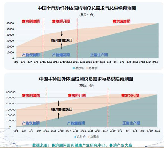 報(bào)告指出,根據(jù)目前產(chǎn)能(全自動紅外體溫檢測儀產(chǎn)量最高1500臺/天,手持式紅外體溫檢測儀的產(chǎn)能最高15000臺/天)理論測算,預(yù)計(jì)僅需1.5個月即可絕對滿足市場需求,報(bào)告預(yù)計(jì),在經(jīng)歷一段產(chǎn)能恢復(fù)期之后,預(yù)計(jì)將從2月11日前后進(jìn)入一段產(chǎn)能爆發(fā)期,臨時(shí)需求缺口會逐漸收窄。