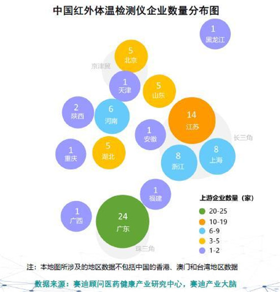 其中,上游企業(yè)集中在東部地區(qū),中下游企業(yè)相對分散。報(bào)告指出,我國紅外體溫檢測儀產(chǎn)業(yè)鏈上游企業(yè)集中在東部地區(qū),中、下游企業(yè)分散在全國多地。除廣東省外,江蘇省也是產(chǎn)業(yè)鏈上、中、下相對集中的省份。