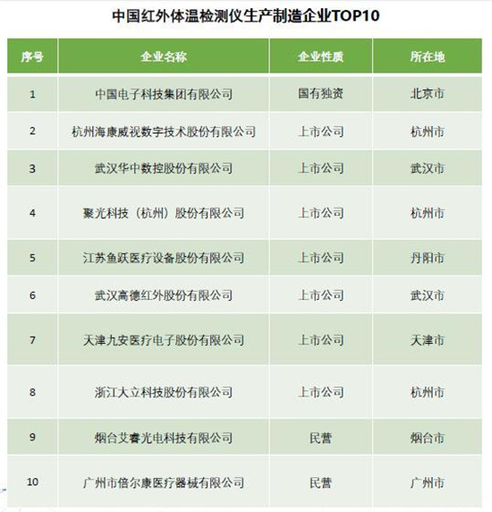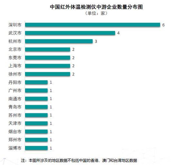 在產(chǎn)業(yè)鏈中游,全國共有30家紅外體溫檢測儀生產(chǎn)企業(yè)。其中,深圳市是擁有紅外體溫檢測儀制造企業(yè)最多的城市,共有6家,占據(jù)全國20%的比例。