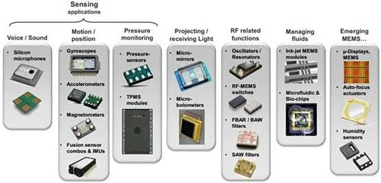 MEMS產(chǎn)品種類繁多,應(yīng)用場景眾多,比如智能手機(jī)中就使用到很多MEMS器件,如加速度計、陀螺儀、電子羅盤、壓力傳感器、硅麥克風(fēng)、圖像傳感器、MEMS微鏡、BAW濾波器和雙工器、射頻開關(guān)、TCXO振蕩器/諧振器等。
