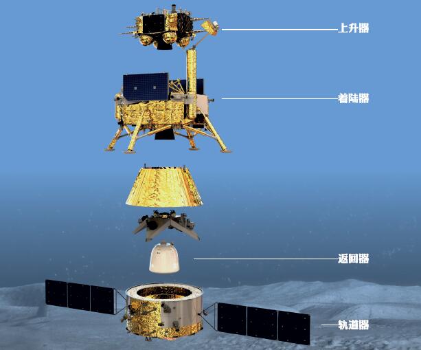 去月球取樣并返回,聽(tīng)著容易做著難。重達(dá)8.2噸的嫦娥五號(hào),由軌道器、返回器、著陸器、上升器四部分組成。整個(gè)任務(wù)中,長(zhǎng)征五號(hào)要把嫦娥五號(hào)推到環(huán)月軌道上,穩(wěn)定后釋放著陸器降落月球表面,挖掘月壤并放入上升器容器中,然后上升器返回到繞月運(yùn)行的軌道器并與之對(duì)接,將裝有月壤的容器放入軌道器上的返回器,最后返回器脫離軌道器返回地球,抵達(dá)地球附近擇機(jī)進(jìn)入大氣層并將容器釋放,科學(xué)家撿到盛有月壤的容器才算完成。