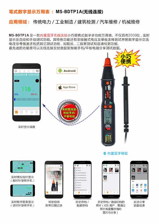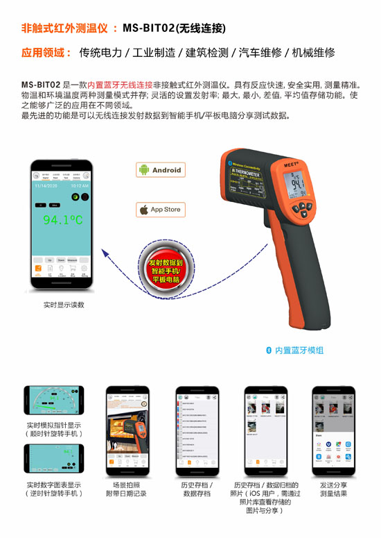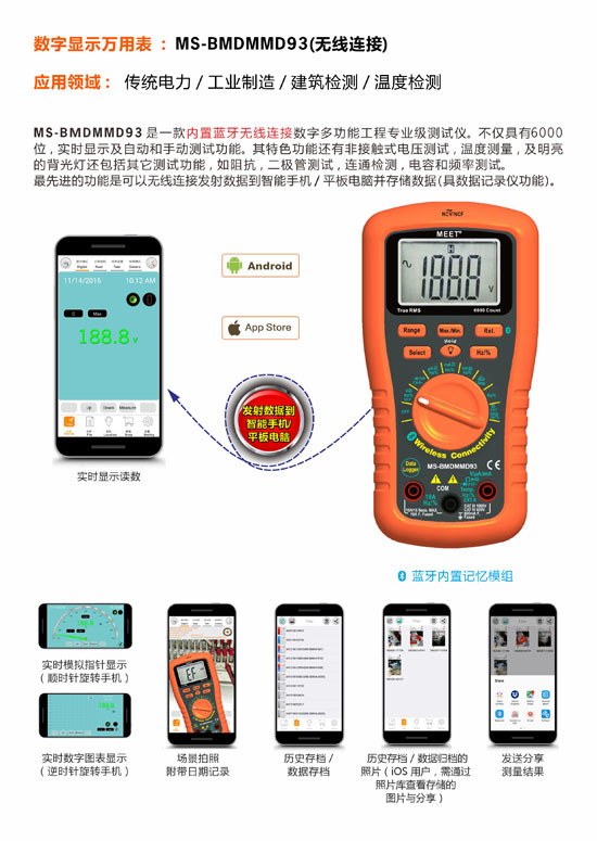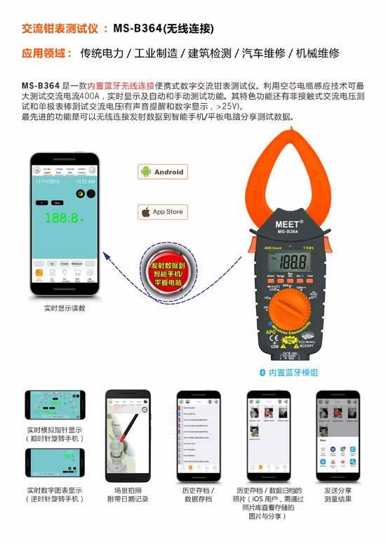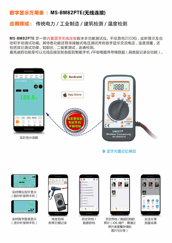 近年由于智能手機(jī)及平板計(jì)算機(jī)普及化,測(cè)試儀的應(yīng)用亦起了相當(dāng)大的變化。有見(jiàn)及此,MEET亦全力開(kāi)發(fā)出多款測(cè)試儀產(chǎn)品包括萬(wàn)能表、鉗表、激光測(cè)距儀、遠(yuǎn)紅外線測(cè)溫儀等可配合藍(lán)牙傳輸及自行研發(fā)的應(yīng)用程序Android及iOS使用,功能先進(jìn),用法簡(jiǎn)單方便,產(chǎn)品大受歡迎。