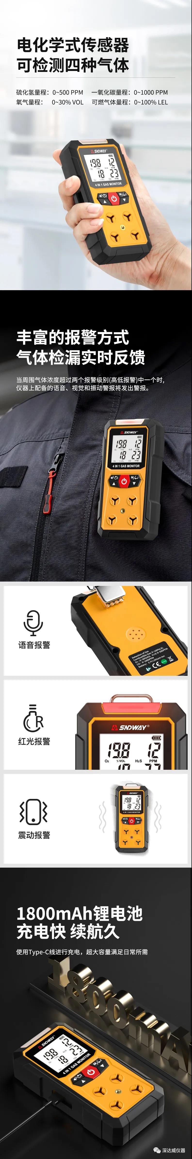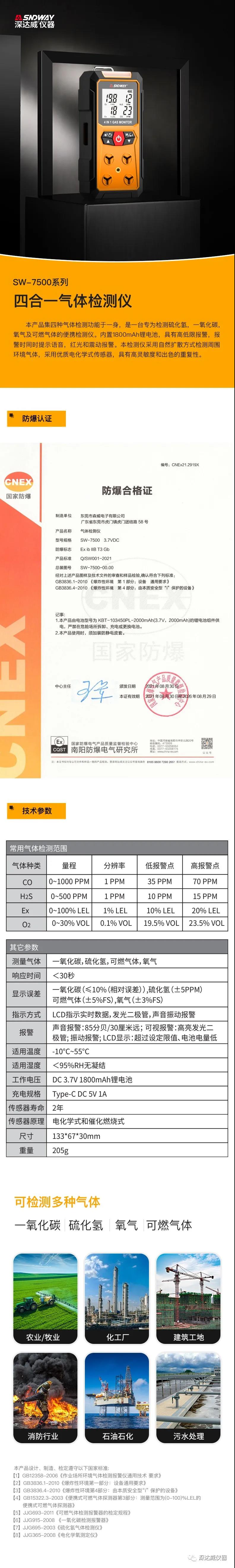 SW-7500系列四合一氣體檢測儀是一臺專為檢測硫化氫,一氧化碳,氧氣及可燃?xì)怏w的便攜式檢測儀。內(nèi)置1800mAh鋰電池,具有高低限報(bào)警,報(bào)警時(shí)同時(shí)提示語音,紅光和震動(dòng)報(bào)警。采用優(yōu)質(zhì)電化學(xué)式氣體傳感器,具有高靈敏度和出色的重復(fù)性。