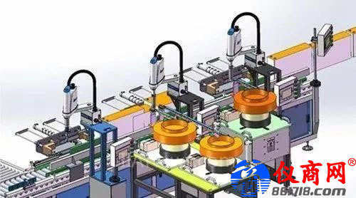 這一方案中配備了3臺(tái)臺(tái)達(dá)SCARA工業(yè)機(jī)器人協(xié)同運(yùn)作。在鉛酸電池裝配線上,鉛酸電池從左向右流動(dòng),第一臺(tái)SCARA工業(yè)機(jī)器人進(jìn)行O型圈的裝配;第二臺(tái)SCARA工業(yè)機(jī)器人進(jìn)行平墊的裝配;第三臺(tái)SCARA工業(yè)機(jī)器人做螺紋壓墊的裝配,以及在振動(dòng)盤(pán)處的螺紋壓墊正反面檢測(cè)。