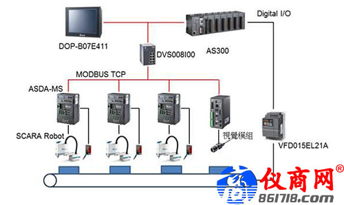 整條裝配線采用臺(tái)達(dá)可編程控制器(PLC)AS300系列做總控,用人機(jī)界面DOP-B07E411做觸控及顯示,通過(guò)工業(yè)以太網(wǎng)交換機(jī)DVS008I00交互信號(hào),通過(guò)及時(shí)傳輸每臺(tái)SCARA工業(yè)機(jī)器人的裝配信號(hào),實(shí)時(shí)監(jiān)控鉛酸電池的裝配狀態(tài)。裝配線利用PLC的IO信號(hào)控制變頻器的啟停,搭配視覺(jué)系統(tǒng)做零組件的篩選。