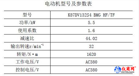 帶式升降吊具系統(tǒng)結(jié)構(gòu)簡單,設(shè)備選型主要集中在升降驅(qū)動電動機上,根據(jù)車間現(xiàn)場的輸入條件和電動機選型。選擇電動機型號及參數(shù)見附表。