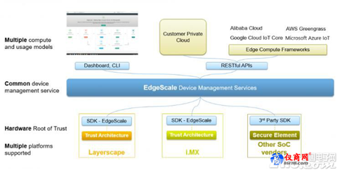 EdgeScale軟件開(kāi)發(fā)平臺(tái),提供基于ARM的Layerscape系列及I.MX系列處理器的軟件開(kāi)發(fā)套件(SDK)。其中,EdgeScale設(shè)備管理服務(wù)層提供對(duì)硬件層及邊沿計(jì)算框架都有統(tǒng)一的API接口,并且支持如阿里云、谷歌云IoT、微軟Azure IoT、亞馬遜Greengrass等。